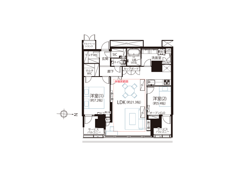 〇床暖房とエアコンがあり、お引越しの初日から快適に過ごせますよ。