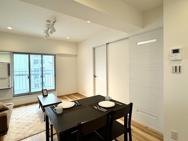 リノベーションが完了した1LDKのお部屋をご紹介。8階・南東西3方向角部屋で、陽当たりも風通しも抜群です☀ 節の表情があるフローリングが使われており、ナチュラルながら程よく個性を感じる空間に仕上がっています。