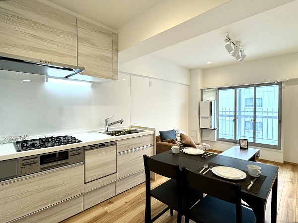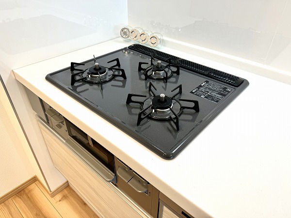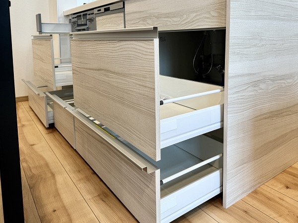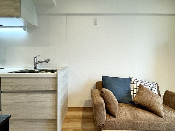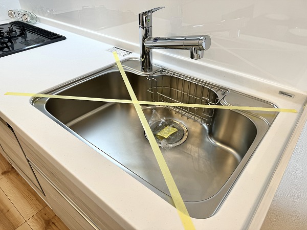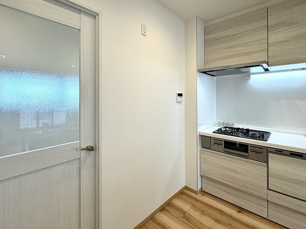 キッチンは空間を効率的に使える壁付けタイプを採用。冷蔵庫の設置位置は複数選べる設計で、暮らしに合わせたアレンジが可能◎リビングスペースを広々と確保できる、使い勝手の良いキッチンです。