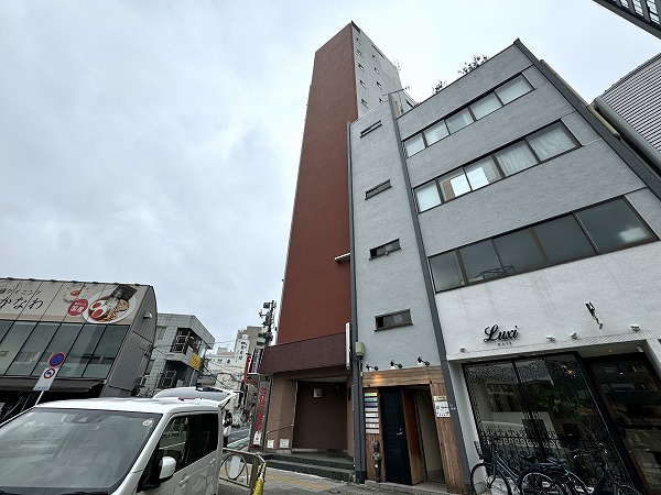高輪台駅からわずか徒歩1分の駅近マンション『藤ビル』。赤いラインが特徴的の外観です。昭和40年築とは思えない現代的なデザインで周りの建物より、一際目立っています✧
