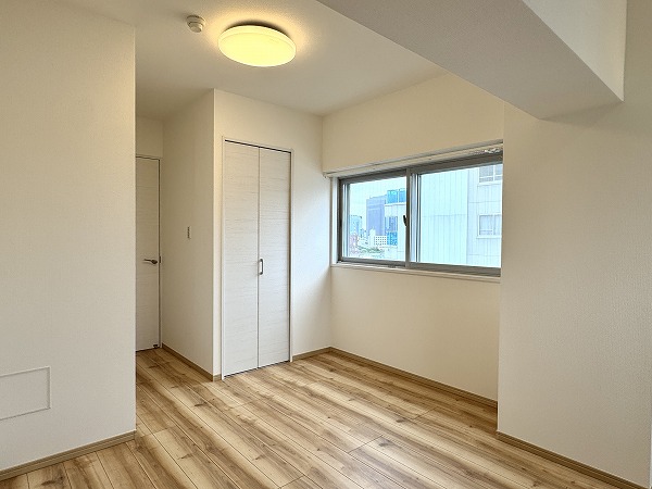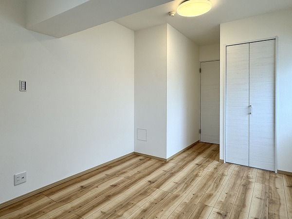 洋室は約5.0帖。南東の2面採光による明るさが魅力です☀ベッドを置いてもゆとりのある広さで、寝室にぴったり。バルコニーはありませんが、ホスクリーンが設置されており室内干しも可能です。