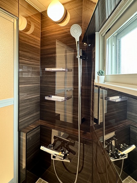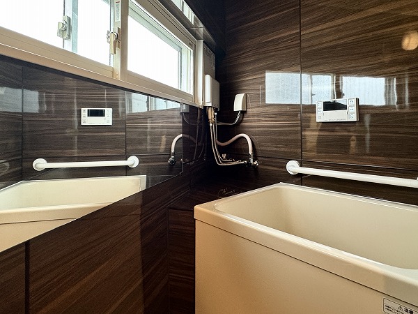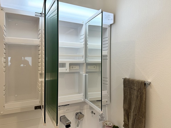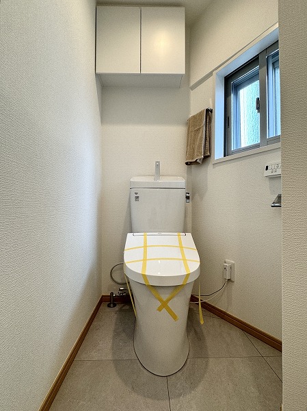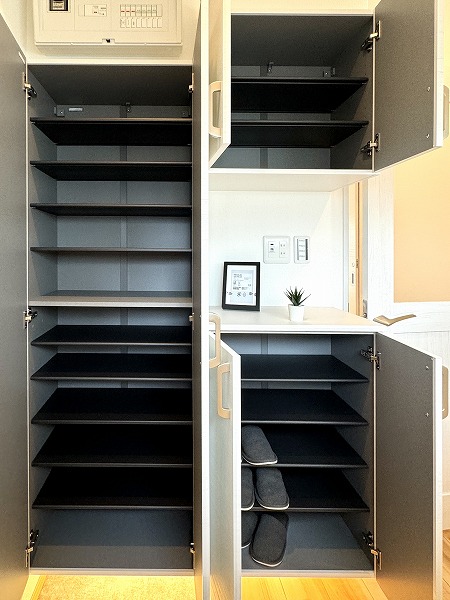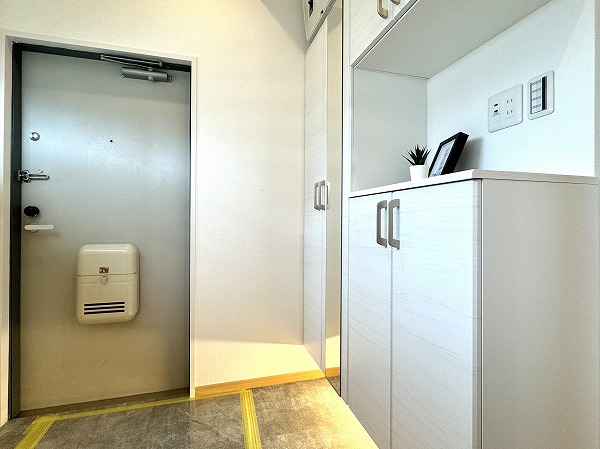 自然光が差し込む小窓付きの玄関は、明るく清潔感のある印象。大型のコの字型シューズクローゼットを備え、収納力も十分。扉のミラーが空間を広く見せ、外出前のチェックにも便利です。