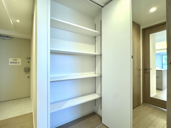 玄関に入ってすぐ右側の扉を開けると、大容量のシューズインクローゼットが備えられていました。これだけ収納量があれば、靴だけではなく掃除道具やストック類、ベビーカーなど様々なものをまとめて収めることができそうです。