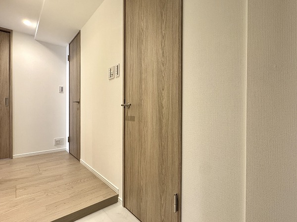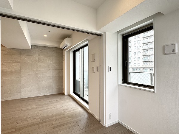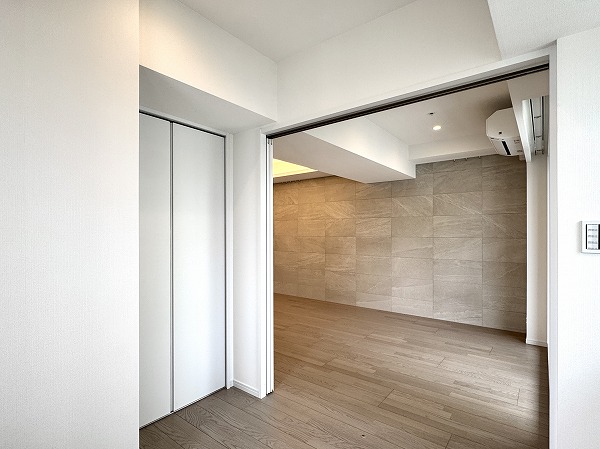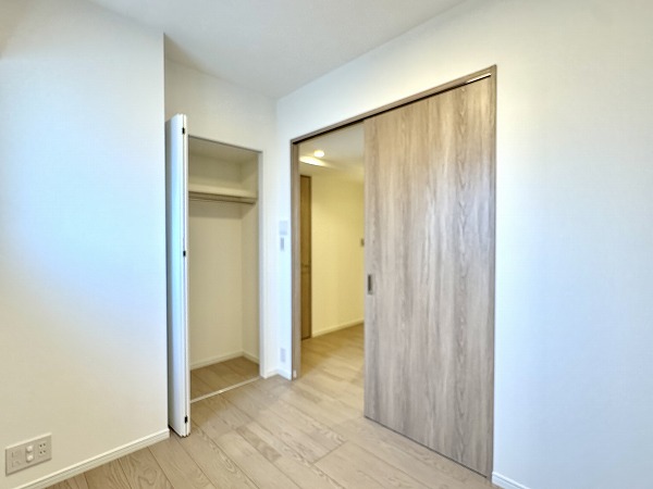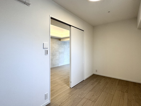 2つの洋室はいずれもメインルームからアクセス可能となっていました。室内扉は壁と同じホワイトが採用され、空間に良く馴じみお部屋が広々と感じられました。バルコニーに面した大きな窓もあり、開放感に溢れ爽やかな印象です。