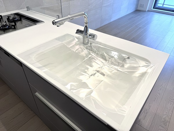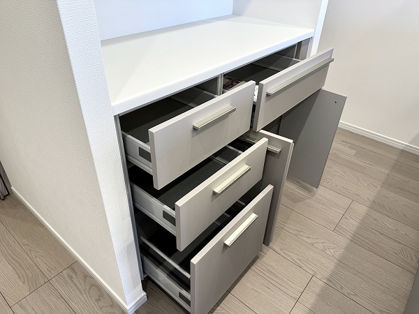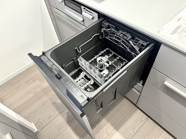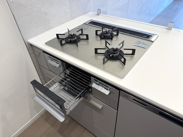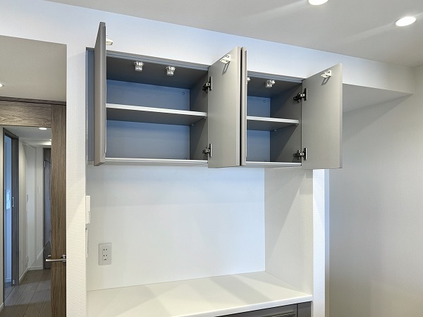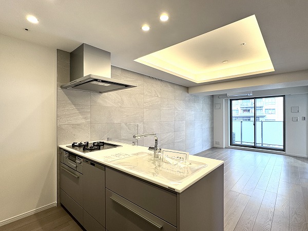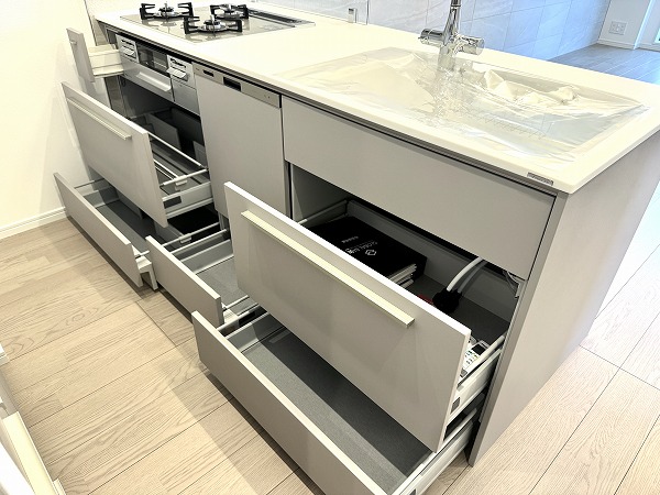 実際にお部屋を見てみて、私が一番だと思ったのはこのフラット対面型のキッチン。マットグレーのキャビネットがオシャレですよね。背面にはキッチンと同じカラーのカップボードも完備し、キッチン用品のしまい場所には困りません。