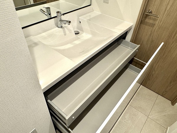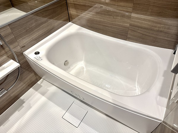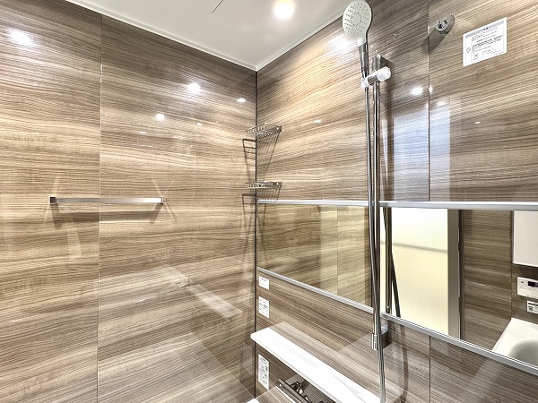 バスルームは木目調のアクセントパネルに囲まれた温かみのある癒し空間に。横幅が広いミラーのおかげで奥行きが感じられ、実寸よりも広々と感じました。ゆったりとしたバスタイムをお楽しみいただけそうですね。