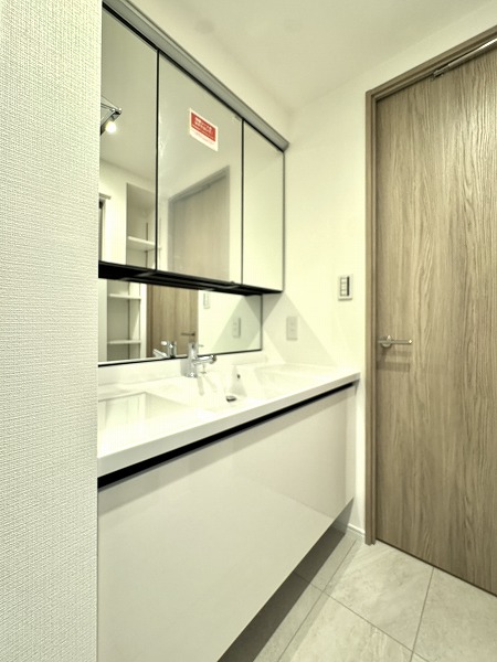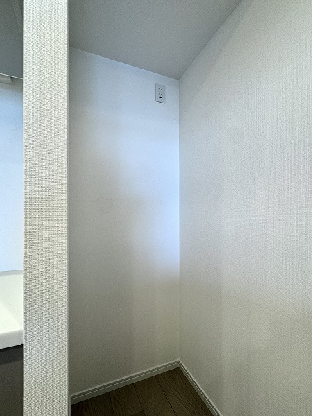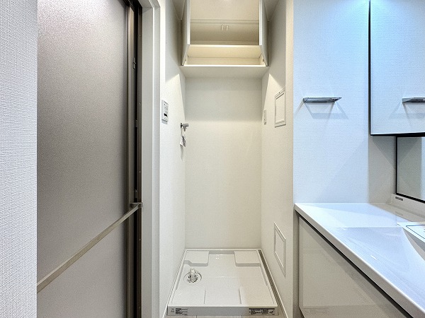 パウダールームには、洗面化粧台、ランドリー、バスルームが集結していました。淡いグレーとホワイトで色味が統一され、シンプルながらオシャレな空間になっていました。