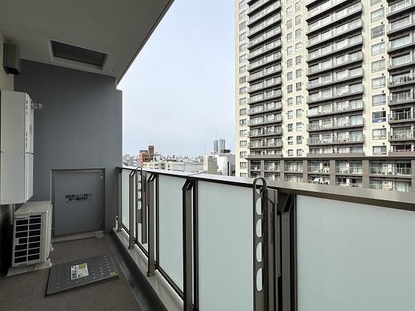 ご紹介したのは11階部分の2SLDK、単身からファミリーまで幅広くお住まいいただけます。リビングダイニングキッチンは約14.1帖で、窓からの光が広がる明るい空間でした。室内は2026年3月にリノベーションが完成しており、キッチンや水まわり設備、内装も新しく整えられ新築に近い感覚で新生活を清々しくスタートできるのではないでしょうか。グレーの対面キッチンや、石目調のアクセントタイルなど上品で落ち着つきのある空間デザインが素敵でした。