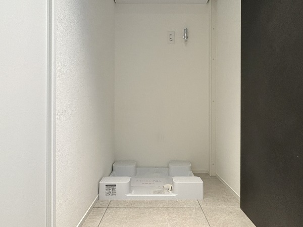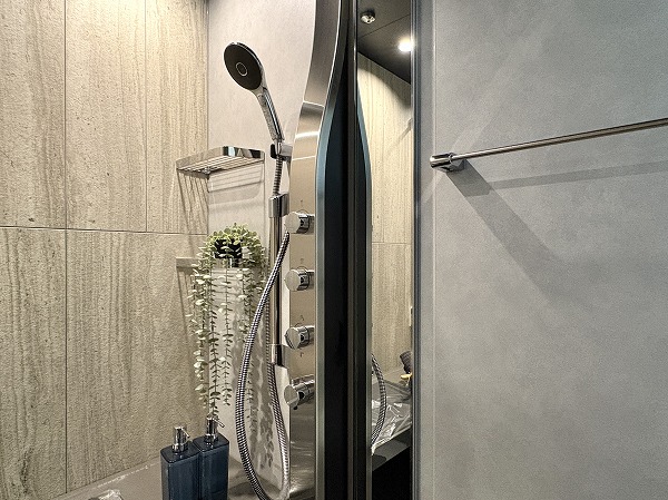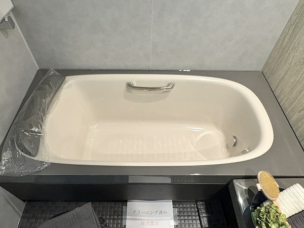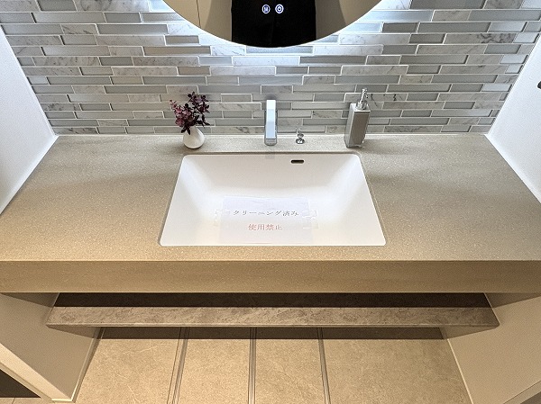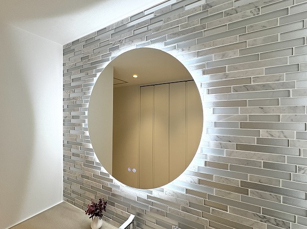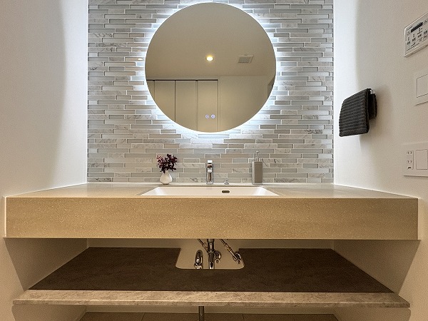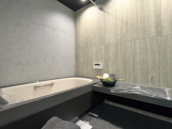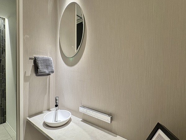 パウダールームは広々としていて、まるでホテルのような空間でした。LED照明が付いた丸型の鏡がアイコニックな洗面化粧台は、幅にゆとりがあるので朝の身支度もバタつくことはありません◎バスルームは上品な大人の空間。ダークトーンの空間は日々の疲れを癒す、極上のリラックスタイムを演出します✧