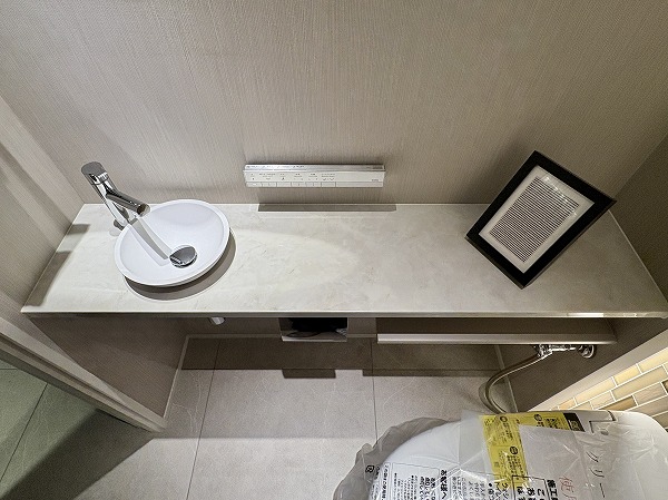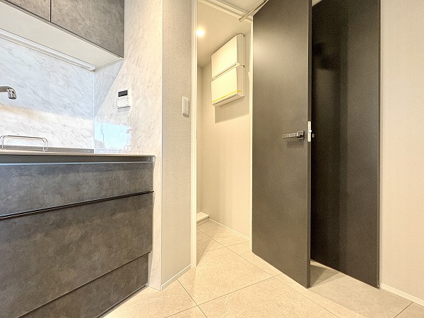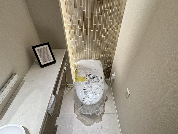 ご多分に漏れず、トイレも非常にオシャレでした...。正面のタイル張りの壁と間接照明が神々しいです。きらびやかですが色味のトーンが落ち着いており、意外と落ち着いた印象でした。リラックスできるトイレは生活の質を高めてくれるので、毎日使うトイレだからこそ、こだわりましょう✧