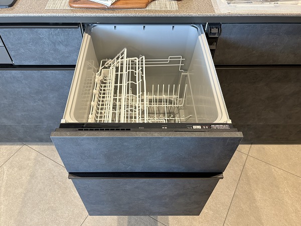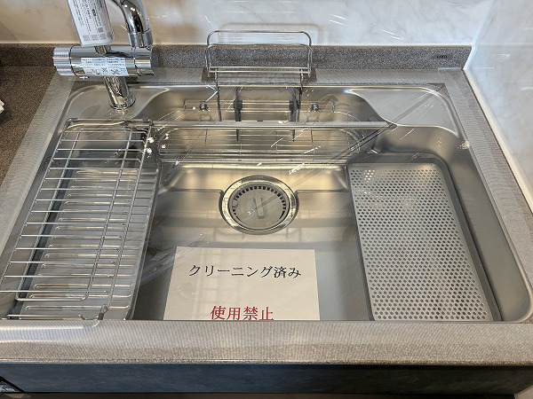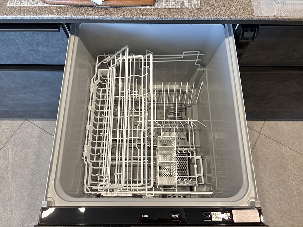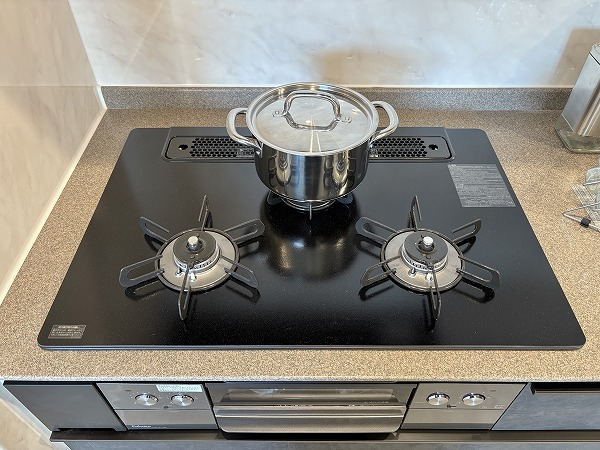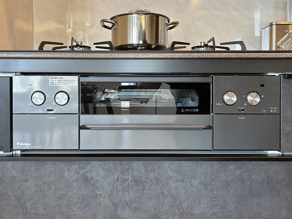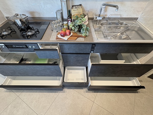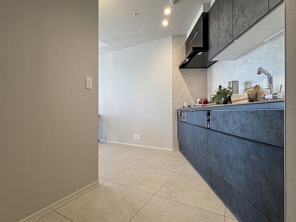 キッチンはウォール型のキッチンで、お調理に没頭できるのが魅力的♩機能性の高いキッチンを最大限に生かすことができます。お料理中はダイニングに背中を向けるような形ですが、背面が適度にオープンな形になっているため、ご家族やご来客とのコミュニケーションも取りやすいです。