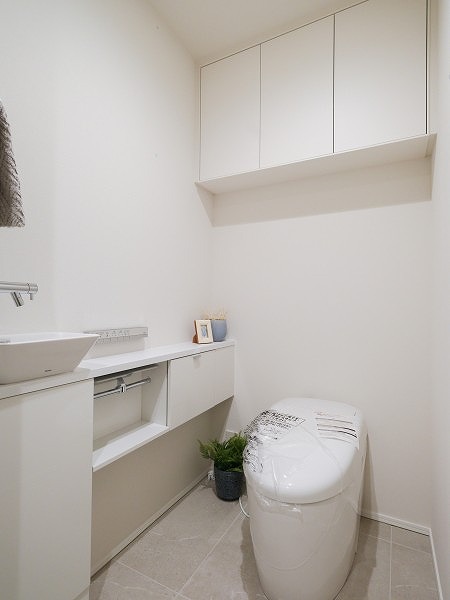 サニタリールームにはダブルボウル仕様の大型洗面化粧台を設置。家族が並んで身支度できるため、朝の混雑も軽減されます。ミラー照明が顔周りを明るく照らし、快適な身支度時間をサポート。収納も充実しており、タオルや日用品をすっきり整頓できます。