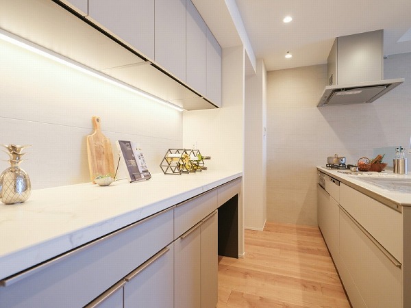 キッチンは約4.0帖のゆとりあるスペース。壁付けタイプながらカウンターが備えられ、Ⅱ型キッチンのような感覚でお使いいただけます。調理スペースと作業スペースを分けやすく動線もスムーズ!カウンター部分に椅子を置けば、軽食を楽しんだりちょっとした作業や読書スペースにもできそう♪
