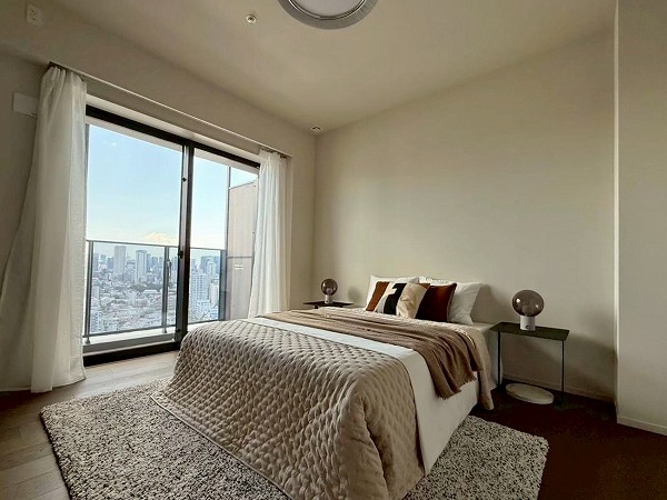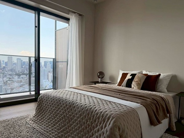 約8.6帖の広さを誇る洋室は主寝室に最適な空間。キングサイズのベッドを配置しても余裕があり、圧迫感を感じさせません。バルコニーへ直接出られる設計のため、朝は外気を感じながらリフレッシュする贅沢な時間を過ごせます。1日の始まりと終わりを、ゆったりと迎えられる寝室ですよ♪