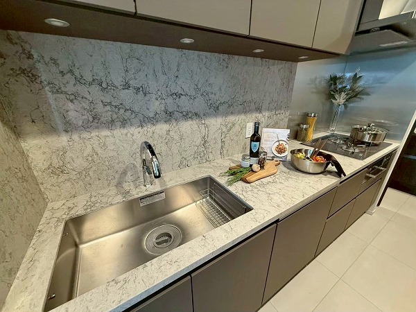 約5.6帖の広さを確保した独立型キッチンは、ゆとりある作業スペースが魅力。複数人で並んで調理しても窮屈さを感じにくく、家族で料理を楽しむ時間も豊かに広がります。カップボードも設置済みで収納力は申し分なし◎独立型ならではの利点として、匂いや煙がリビングへ広がりにくい点も嬉しいポイント。