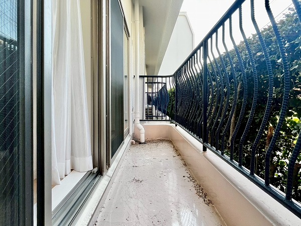 手前のキッチン付近にはダイニングテーブルを置いて、窓際に大きなテレビやソファを設ければ活動のスペースを分けられるのが魅力的。掃き出し窓から続くバルコニーは高さのある植栽がしっかりと覆い、プライバシー面も◎洗濯物を安心して外干しできます。