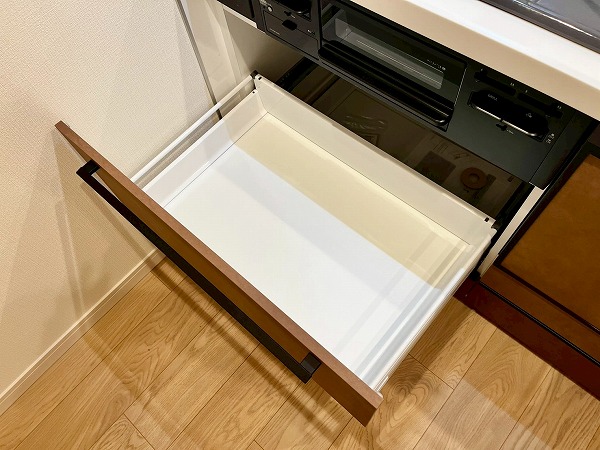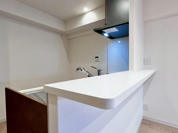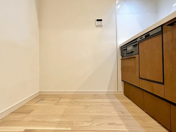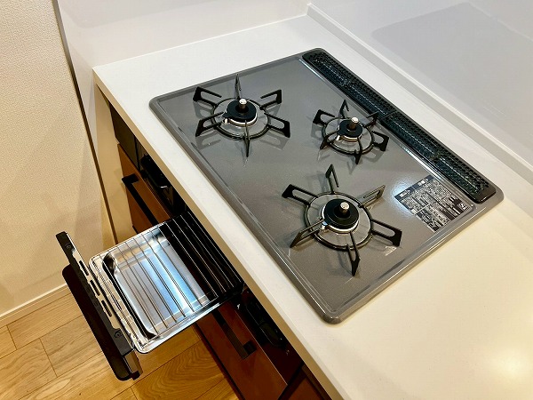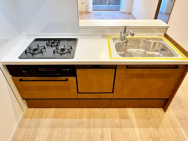 セミオープンキッチンにはグリル付き3口コンロと食洗機を搭載し、充実の調理環境でお料理を楽しめます。キッチンの対面側はちょっとした食器棚や大きめの冷蔵庫を置けそうなゆとりある設計がうれしいですね。キッチン回りに余白が生まれると、お料理も心から楽しめそうです。