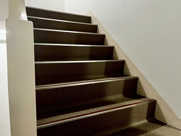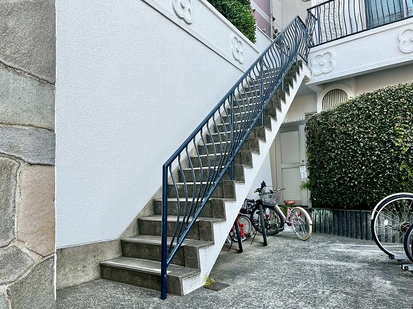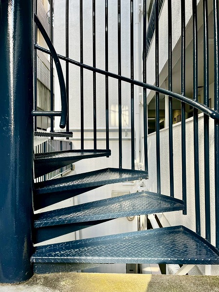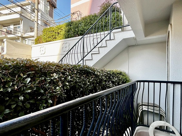 エレベーターから続く外廊下は空気が通り抜け、ごみ1つなく管理が行き届いた印象。エントランスからお部屋に向かう途中にいくつかの階段がありました。目的に応じて使い分けられそうですね。