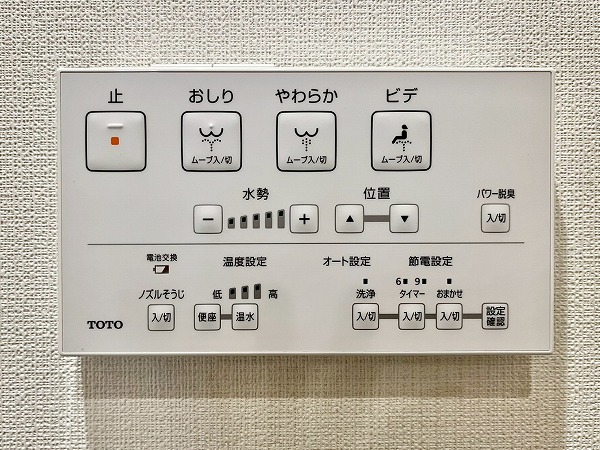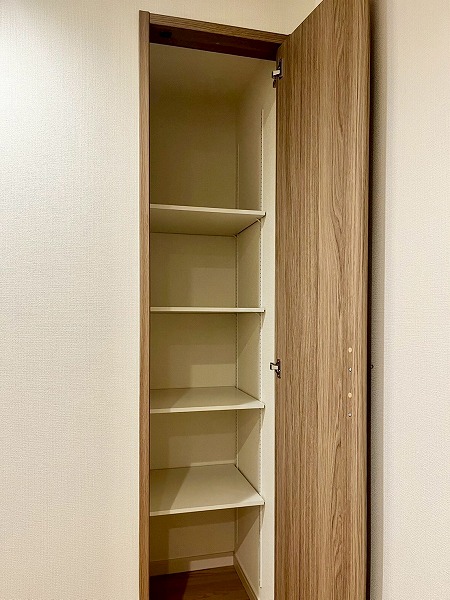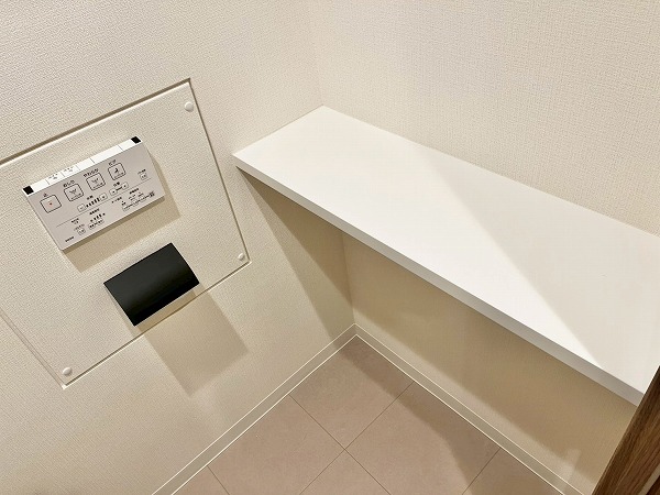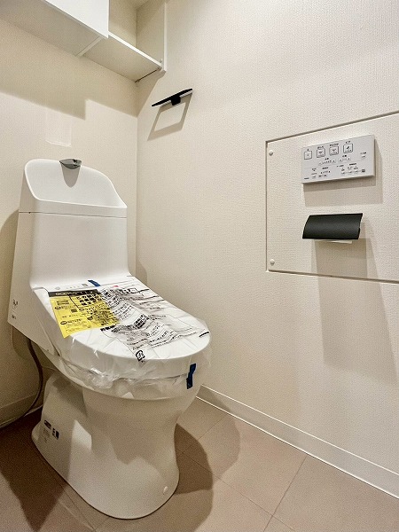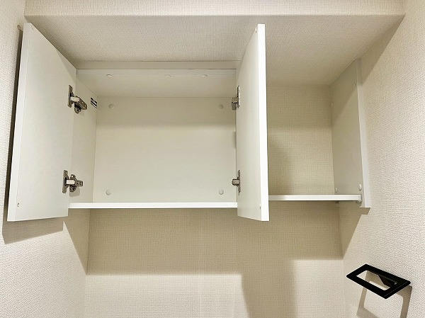 明るく清潔感の溢れるウォシュレットトイレ。前面にニッチ棚が設けられ、フレグランス・小物や使用頻度の多いトイレットペーパーなどを置くのが便利そうです。上部の収納にはお掃除用具やストックの収納がぴったり。