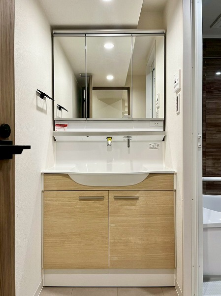 水回りが集まり、使いやすさにこだわったパウダールーム。外出先から帰宅した際にすぐに洗面台へ向かいやすい動線設計になっています。洗面ボウルは前に張り出しており、洗顔の際に床が水浸しになる心配は最小限に◎