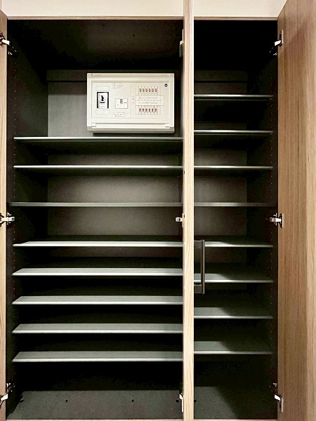 玄関ポーチは浮遊感のあるシューズボックスと石調の床材が洗練された印象を作り出し、帰宅のたびに気持ちの良い空間が迎えてくれます。高さのある靴やオフシーズンのシューズも収まる優秀なシューズボックスがポイント。お出かけ前にはミラーで全身のコーディネートチェックが可能です◎