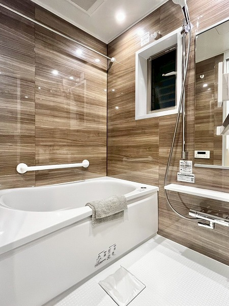 バスルームはブラウン基調の空間がログハウスのような温かさを醸し出し、1日の疲れをしっかりと癒してくれそうです。追い焚き機能を使用すれば、長風呂の際もお湯全体をしっかりと温めなおしてくれます。浴室乾燥機能+窓を使った換気でカビひとつない清潔なバスルームに✧