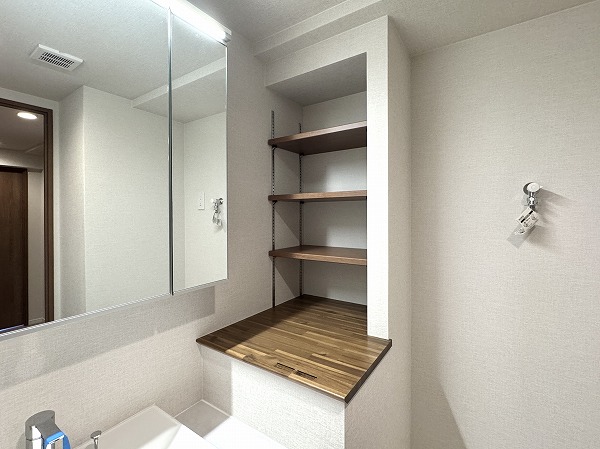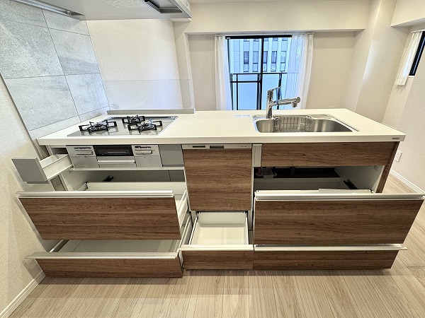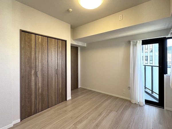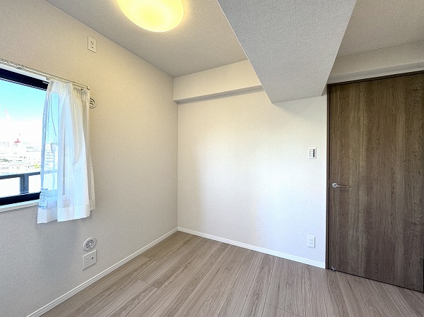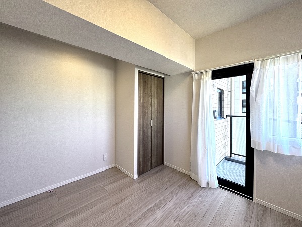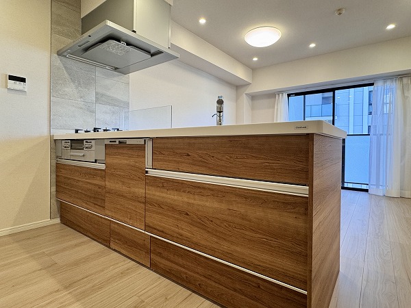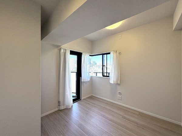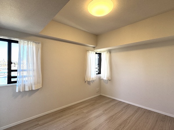 お部屋は9階角住戸の2LDK。専有面積は約53㎡で、ゆったりした1人暮らしから3人家族まで幅広くお住まいいただけそうです。全ての居室が二面採光&独立したバルコニーに面し、上階ならではの奥行きのある眺望をお楽しみいただけます。約13帖のメインルームには床暖房が取り入れられ、寒い季節でも足元からポカポカに♪リノベーションによって新規交換されたフラット対面型のキッチンは、ワークトップにホワイトを採用したことでお部屋がパッと明るい印象に感じられました。全体的にナチュラルな内装デザインとなっており、どんな家具とも馴染みが良くどかこかホッとする居心地の良いお部屋に仕上げることができるのではないでしょうか。