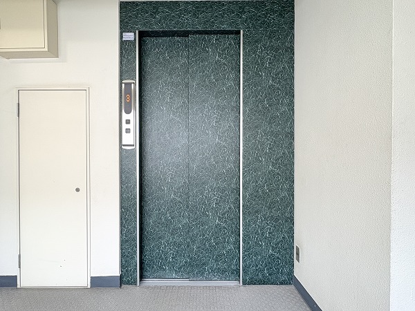 レトロな雰囲気が漂う緑色のエレベーターが1基設置されていました。総戸数38戸のため、ラッシュ時もそこまで混雑の心配は無いかと思います。内階段のご用意があったので、状況に応じてそちらをご活用ください。