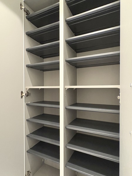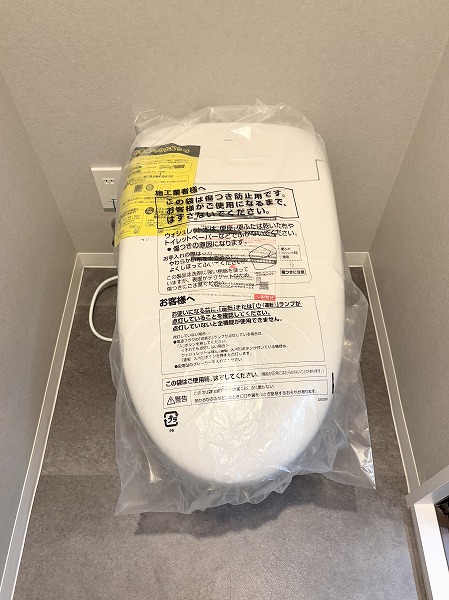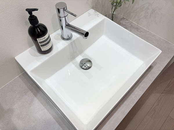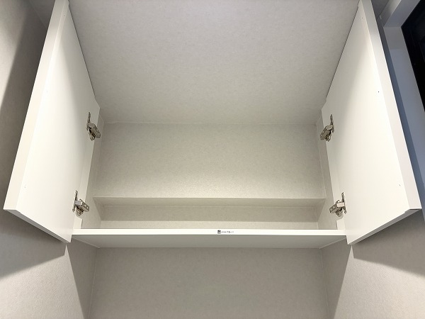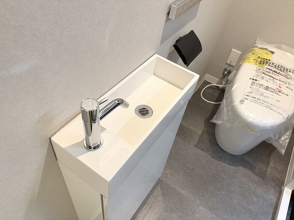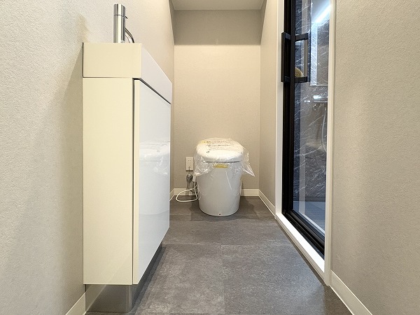 トイレの横には手洗い場が設けられており、すぐに手を洗うことができて衛生的です✦汚れが目立ちにくいグレーの床なのが嬉しいですね。上部にはトイレットペーパーや清掃用品をしまうことのできる棚がご用意されています。
