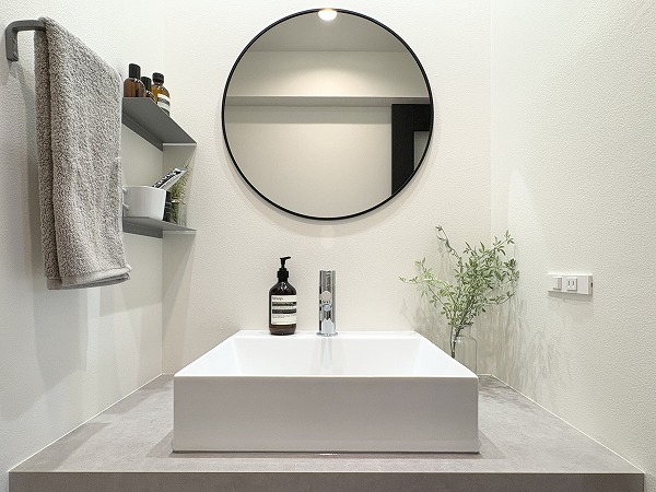 黒い縁の丸い鏡がオシャレな洗面台。下部にはタオルや化粧品をしまっておくスペースがあるので、洗面台周りに物が散らばることなくスッキリとした状態を保てそうです。よく使用する化粧水やコップなどは、壁に付いているラックに置いておくことができます。
