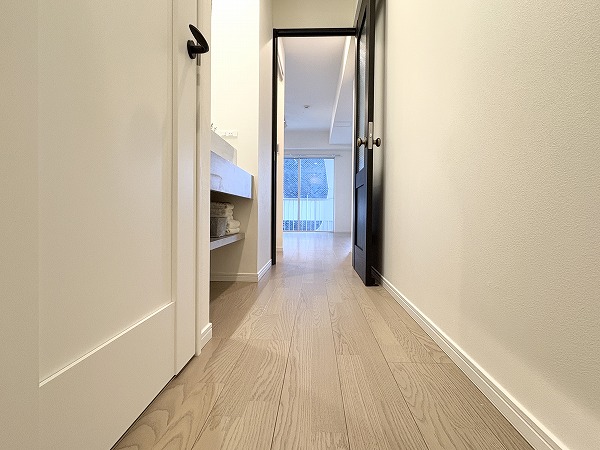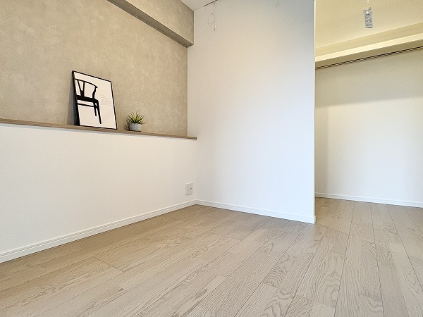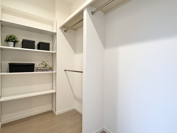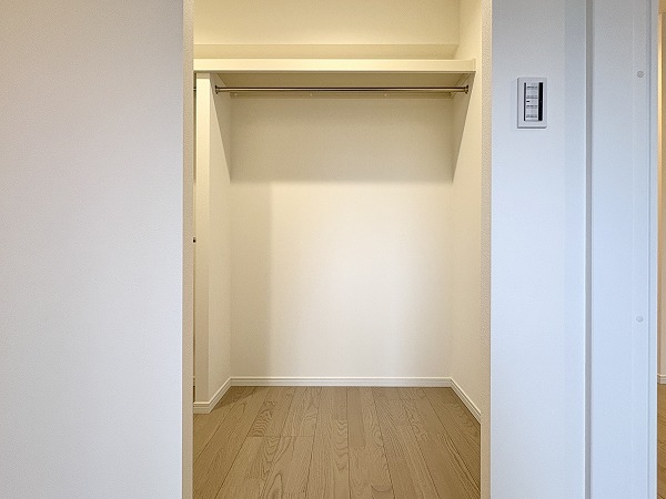 洋室には大容量のウォークインクローゼットが設置されています。丈の長いワンピースやアウターをシワを付けずに保管できますよ◎カバンや小物類をスッキリと収納できそうな可動棚が設けられているのも嬉しいポイント。