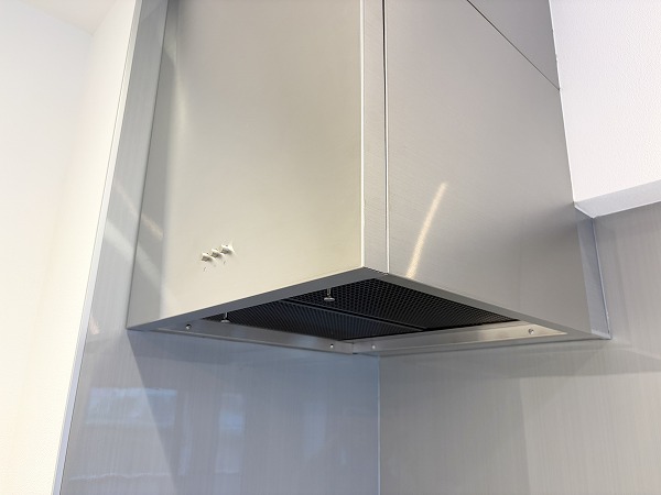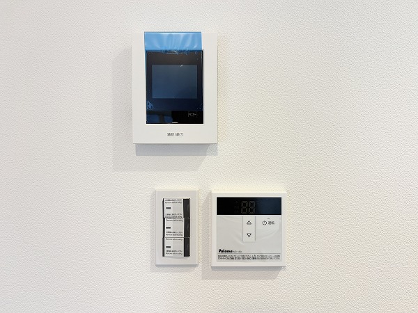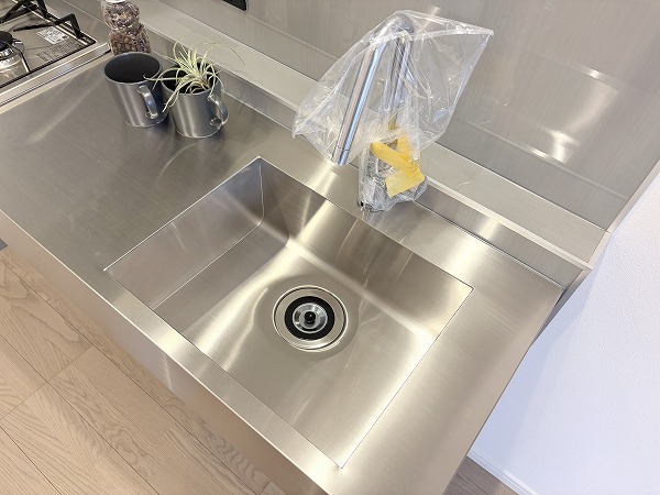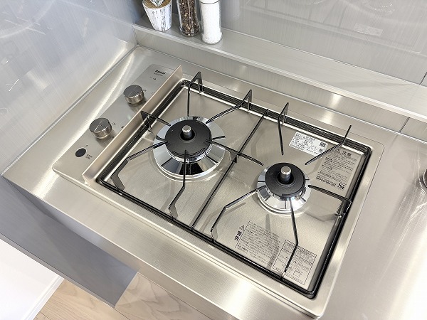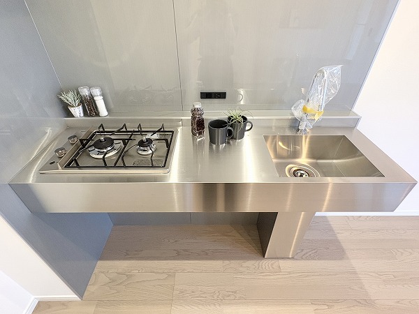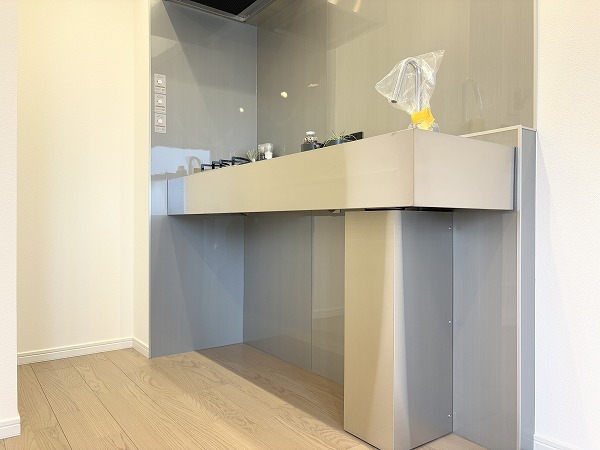 スタイリッシュなデザインのキッチンは、お料理に集中しやすい壁付け型です。バックパネルはマグネットボードになっており、買い出しに必要なメモを忘れないように貼っておくことができますよ。コンロ下にはキッチン用品のストックやゴミ箱を置くことのできるスペースが確保されています。