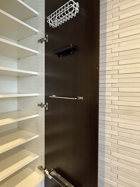 真っすぐと続くフラットなタイル貼りのアプローチ。奥から照らす暖色のライトが高級感を漂わせます。庇も大きく造られているので、雨の日などに雨具の準備で濡れてしまう心配はありません◎