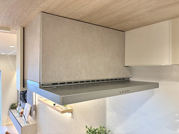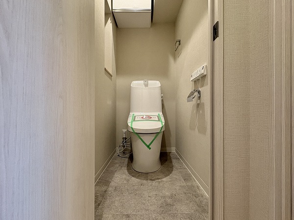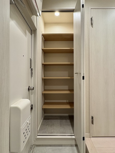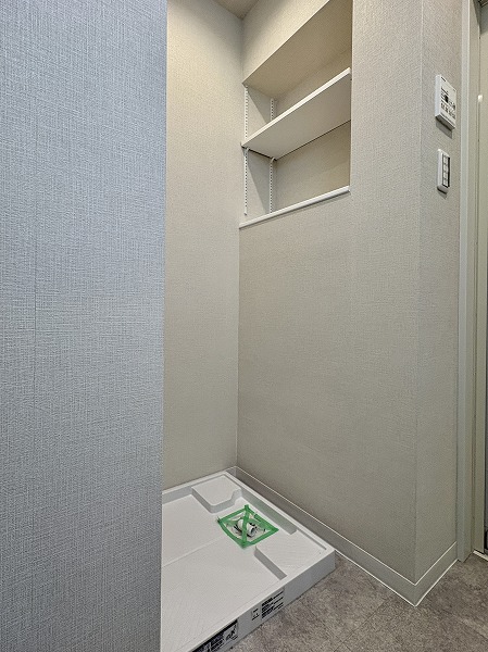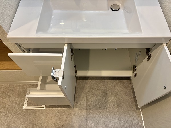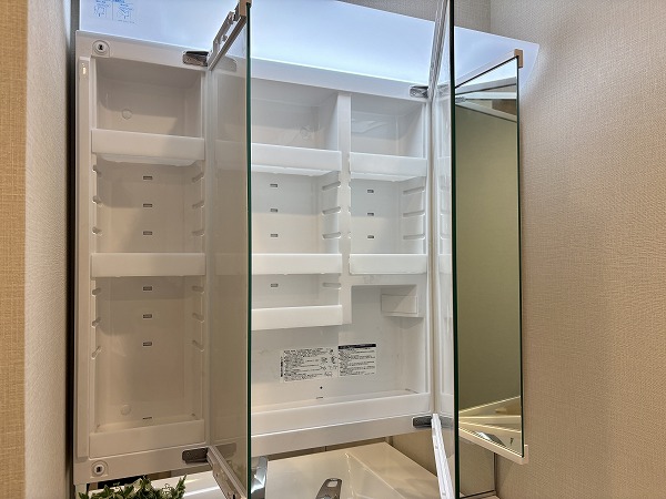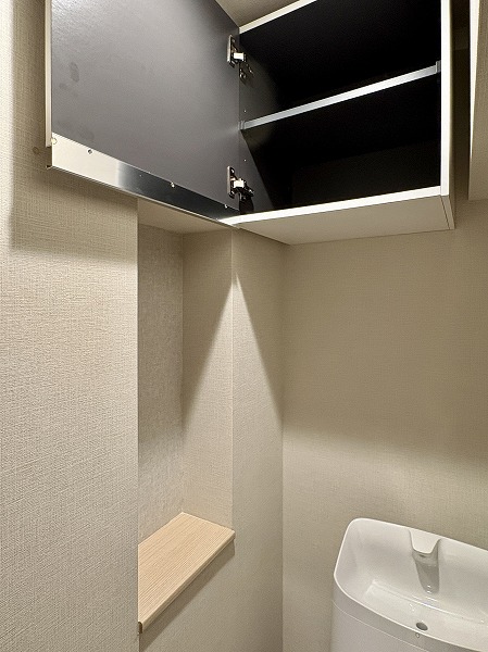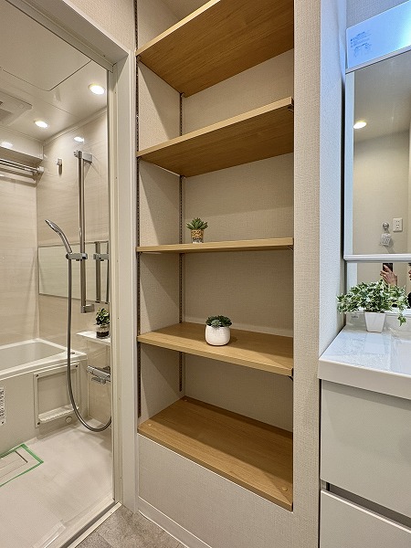 パウダールームも優しい色味で統一されており、リラックスできそうな空間。トイレ以外の水回りが集約されているうえ、便利な収納棚が設置されているので、お掃除も楽々行えそうです♩
