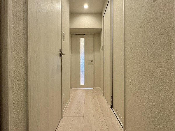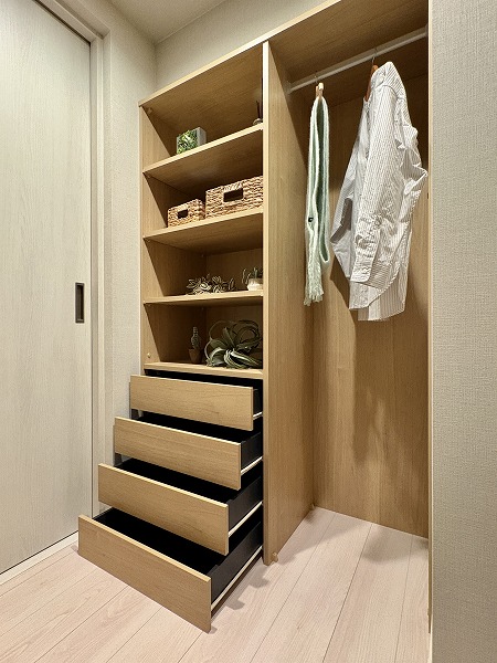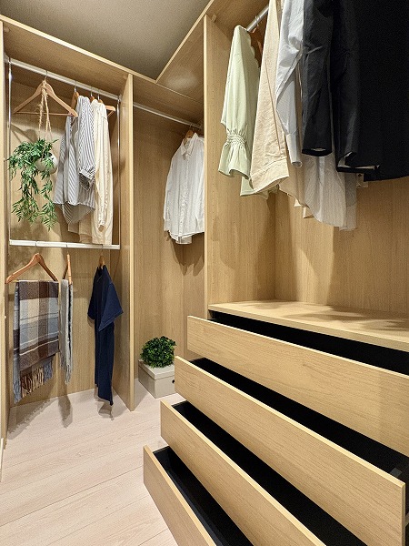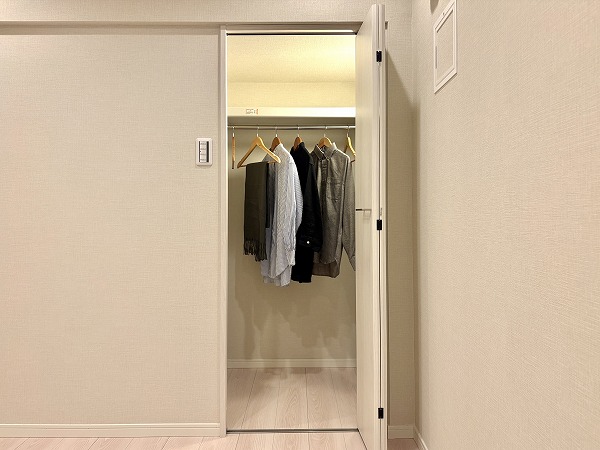 廊下にあるWICはなかなかの収納力◎お洋服が多くて困っているという方もこの広さなら安心です。ハンガーラックと引き出しを組み合わせれば、お洋服が散らかることも少なくなりますよ。
