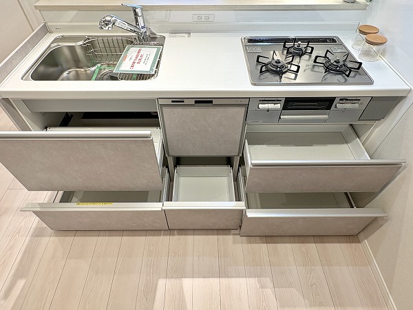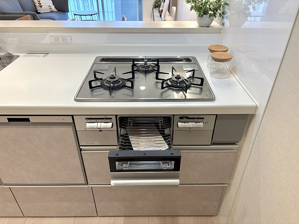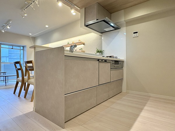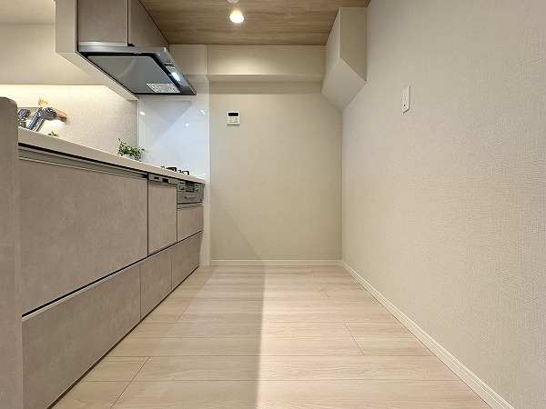 こちらがキッチンです。お部屋のカラーリングに馴染むシンプルな見た目ですが、機能性は抜群!広々ともうけられた調理スペースで、ご自身のお料理スキルを最大限に発揮してください◎