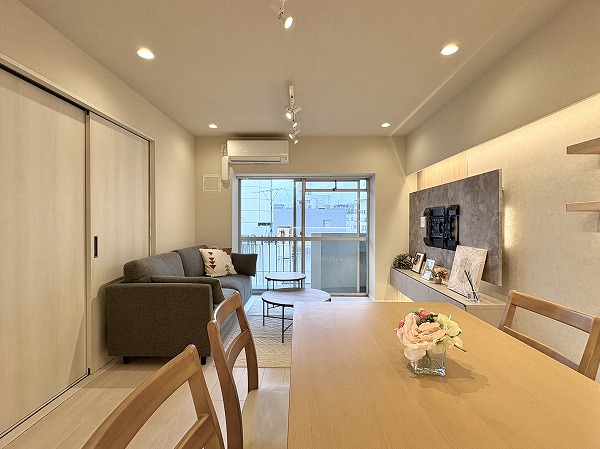 代々木駅の西口に佇むマンション『メゾンドール代々木』の7階にあるお部屋を訪れました。間取りは2LDKで専有面積は61.81㎡の広さです。新規フルリノベーションにより、1971年築マンションとは思えないお洒落な空間に生まれ変わりました♩嬉しい家具付きで、そのままお住まいいただけます。