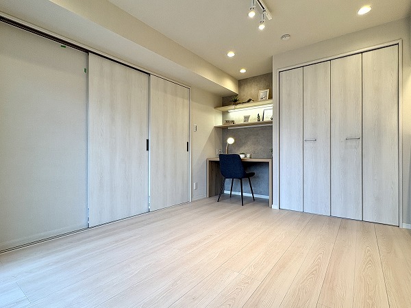 約7.2帖の洋室にはDENスペースが設けられておりました。適度な明るさをキープしてくれる間接照明が上品です。夜は壁側についたコーニス照明と組み合わせて、ラグジュアリーな雰囲気で就寝の準備を♩