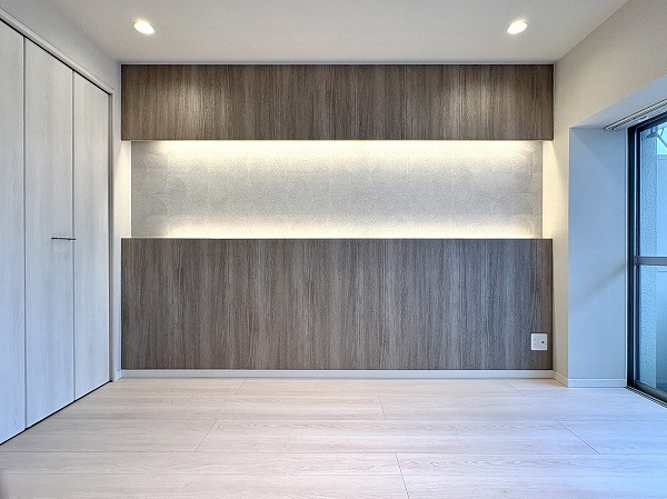 約13.1帖のメインルームは端から端まで見通せる縦長の造りになっておりました。コーブ照明×コーニス照明×ダウンライトの組み合わせにより各照明のON/OFFが切り替えられ、繊細な明るさ調節が可能です◎