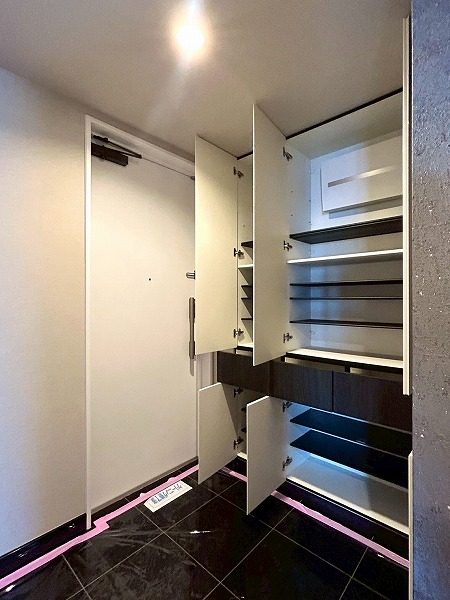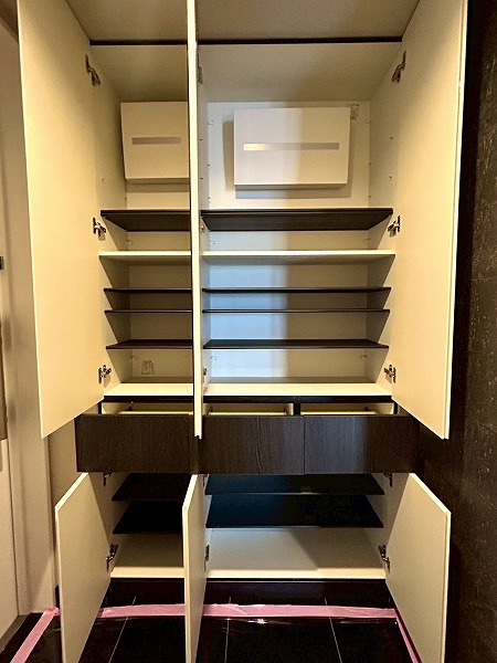 玄関は座って靴を脱ぎ履きするスペースが十分にありました。シューズボックスも高さがあり、靴や日用品などをスッキリ収納して玄関を広々と使えそう◎