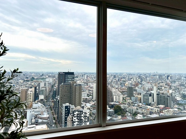 開放感があるエントランスホール。オシャレな椅子やテーブルがありました。窓に面していてとても開放感があり、緑を眺めながらゆっくりすれば良い気分転換になりそうですね♪また、マンションの30階には新宿新都心の景色を一望できるスカイラウンジが用意されています✦