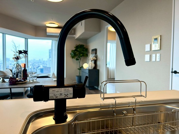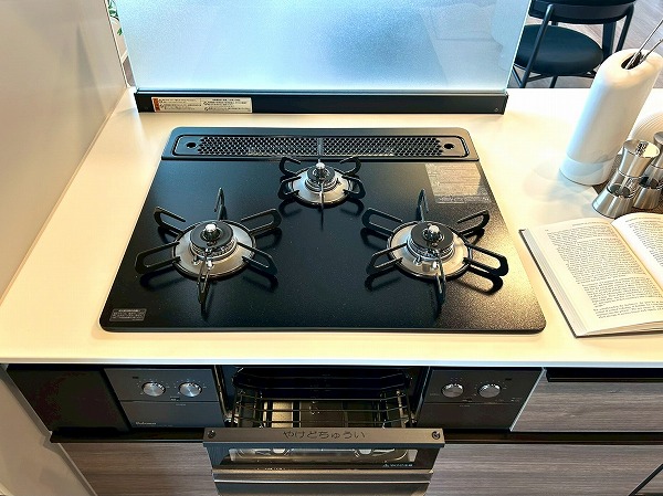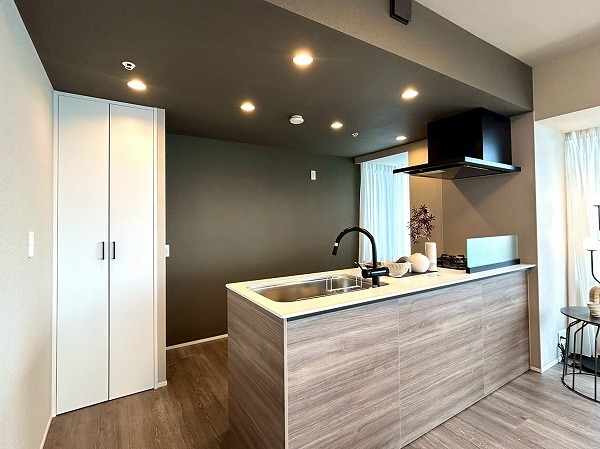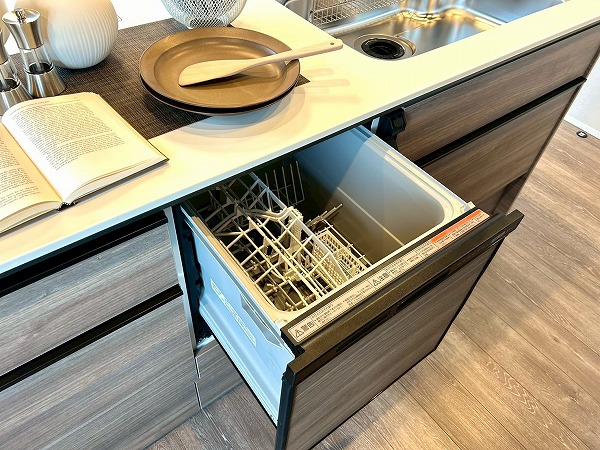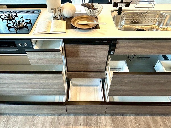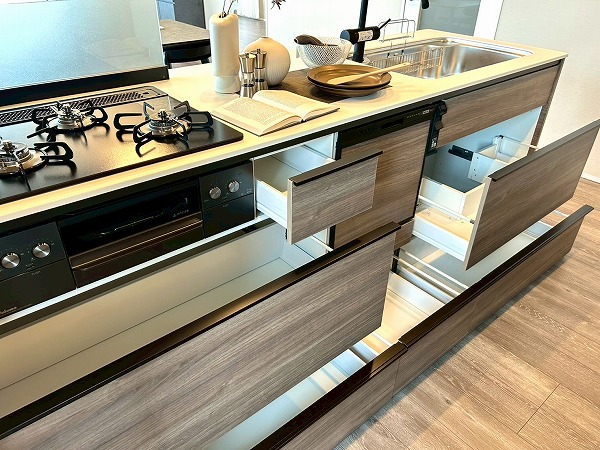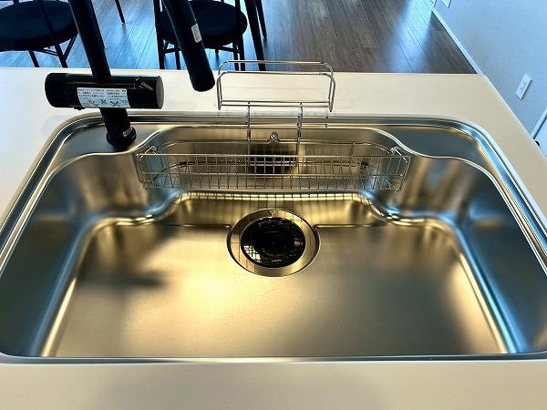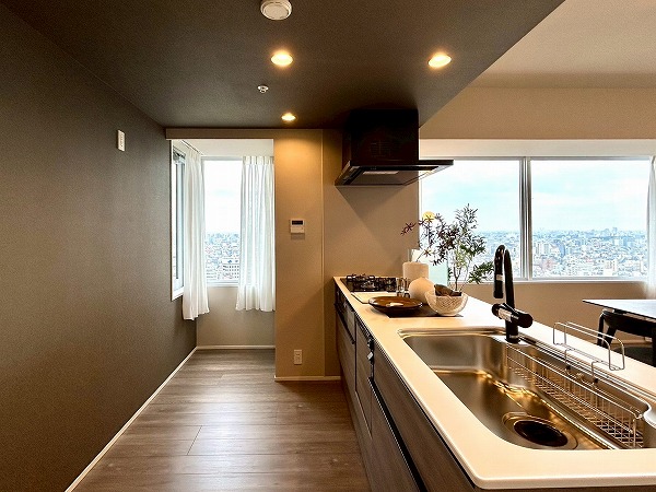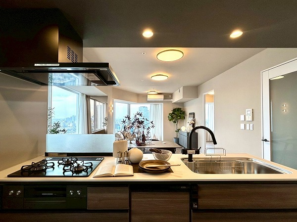 キッチンは対面式となっており、家族や友人とお料理をしながらコミュニケーションを取れますよ。キッチンの正面は大きな窓があり、眺めも最高で気分良くお料理できそうですね。また、ディスポーザーが設置されており、生ゴミの処理が楽々◎