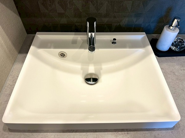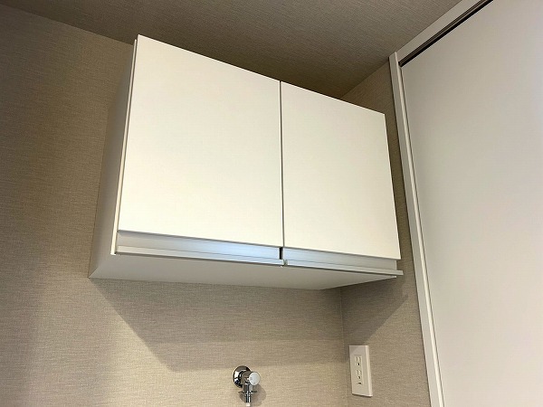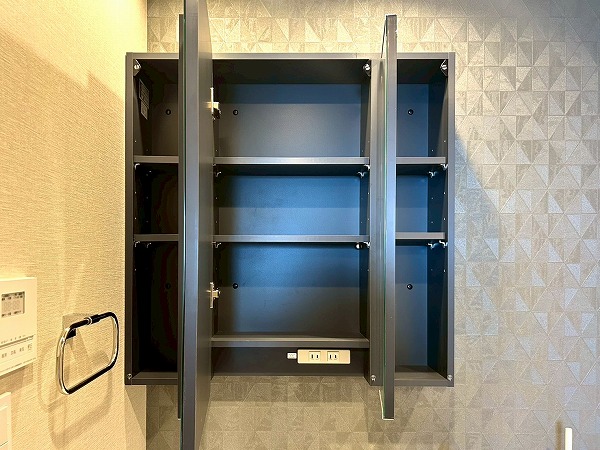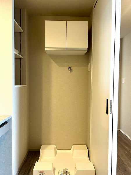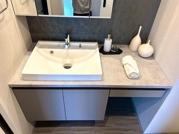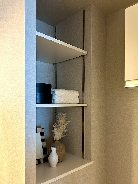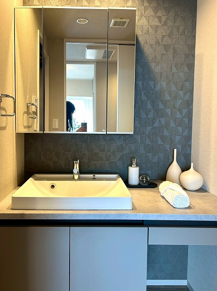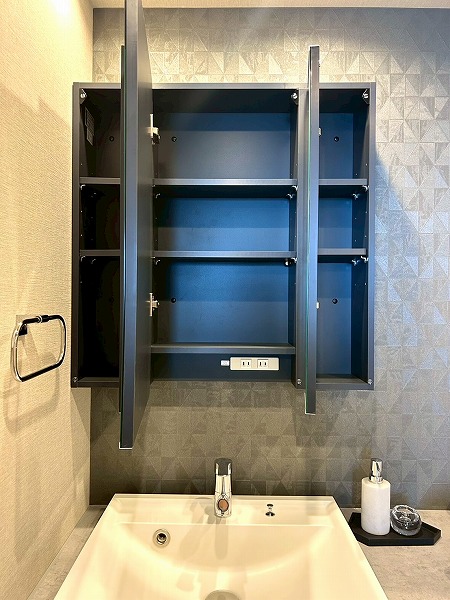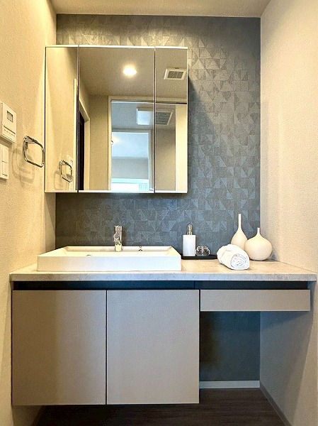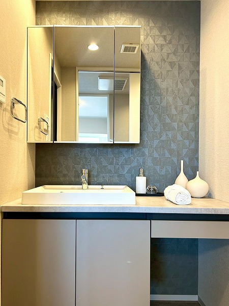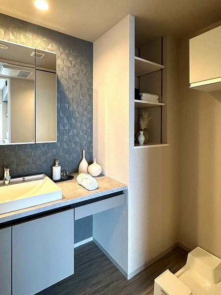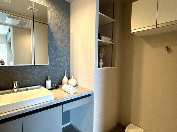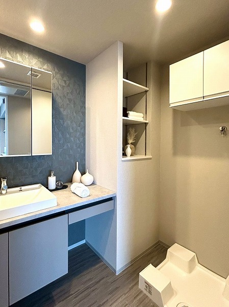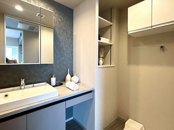洗面化粧台、洗濯機置き場、バスルームが集結したパウダールーム。洗面化粧台の青色のワンポイントクロスはお洒落で落ち着いた雰囲気を演出✧ニッチ収納があり、散らかりがちな水回りも綺麗に整頓できそうですね!