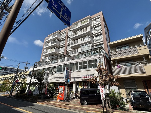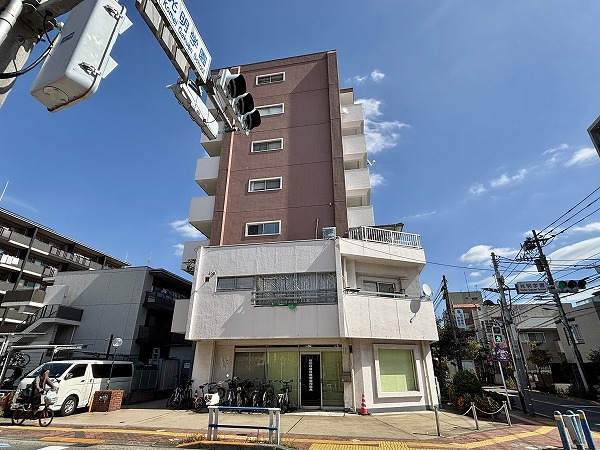 『梅丘アイワマンション』は1970年竣工、7階建て・総戸数28戸のコンパクトなマンションです。赤堤通りと区役所西通りが交わる交差点近くにあり、ブラウンとホワイトを基調にした外観は存在感がありつつも街並みに馴染んでいます。