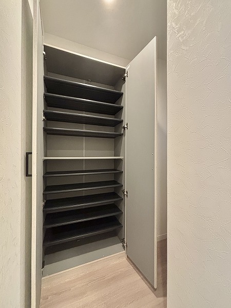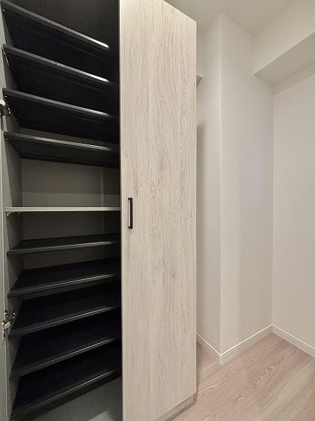 約1.5帖の納戸はリビングから出入り可能で、日用品のストックや季節家電、スーツケースなどの収納に便利。かさばる荷物をまとめて収納できるため、居住空間を広く使うことができ、快適な暮らしをサポートします。