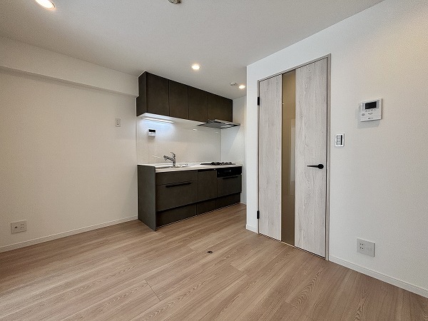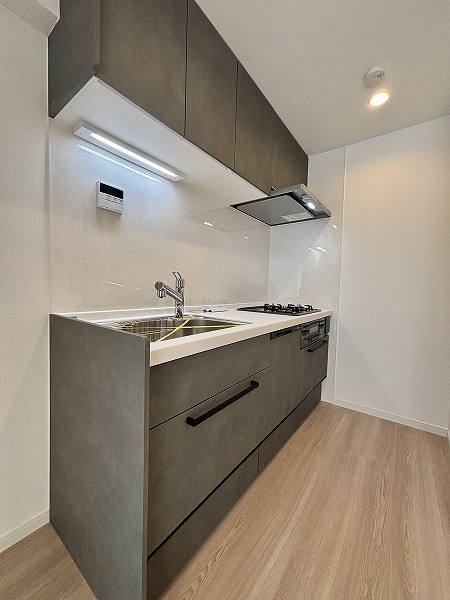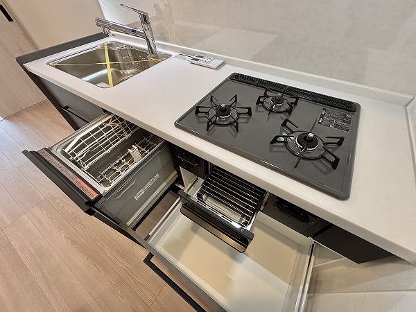 メインルームを広く使える壁付キッチンは、調理が快適で効率的◎3口コンロにグリル、さらに食洗機も備わっているため、家事の負担を軽減できます。くつろぎの自分時間が増えそうです。