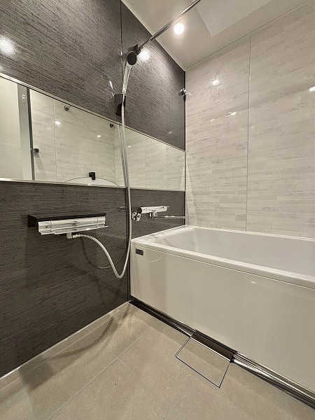 バスルームは木目デザインが温かみを演出するリラックス空間。リノベーションにより新設され、清潔感や美しさも抜群です。追い焚き機能付きでご家族それぞれの入浴時間に合わせていつでも温かいお湯でおくつろぎいただけますよ♩