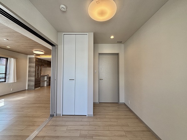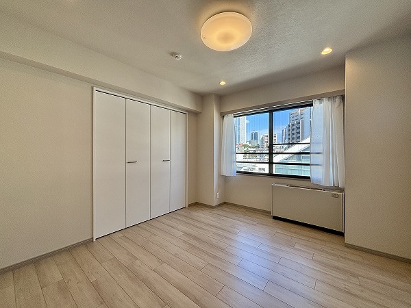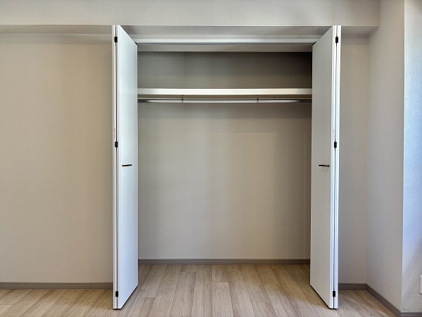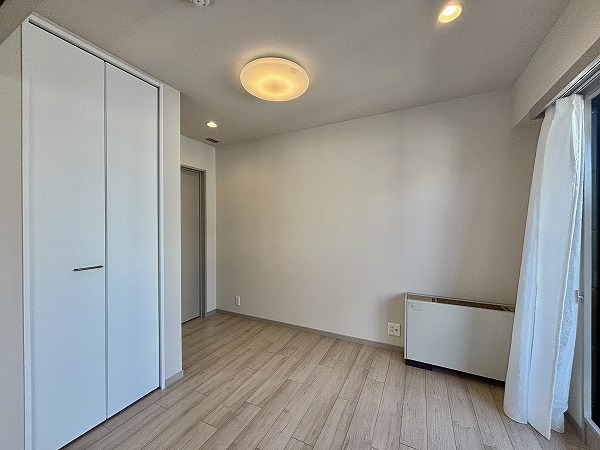 明るい陽射しが差し込む洋室は、主寝室にぴったりの落ち着いた空間。ダブルベッドを置いても余裕があり、ゆったりとした時間を過ごせます。クローゼットはワイドサイズで衣類をすっきり収納可能。快適な眠りを誘うお部屋です。