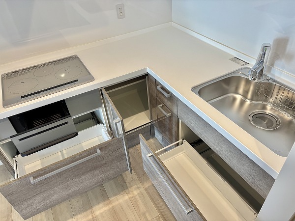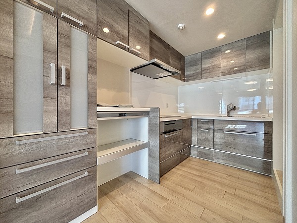 L字型のキッチンは新しく交換され、デザイン性と実用性を兼ね備えています。豊富な収納で調理器具もすっきり整頓。スムーズな同線で毎日の料理も快適に。ご家族やゲストとキッチンを囲みながら、会話も弾みそうですね♡