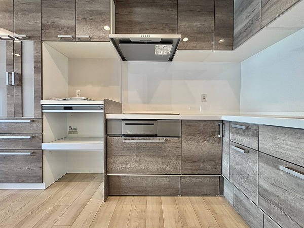 料理に集中できる壁付けキッチンは、落ち着いたスモーキーブラウンの配色で空間全体に上品でおしゃれな印象を齎しています♩IHコンロや食洗機完備で料理好きな方はもちろん、忙しい毎日でも快適に料理を楽しみたい方にぴったりのキッチンですね✿